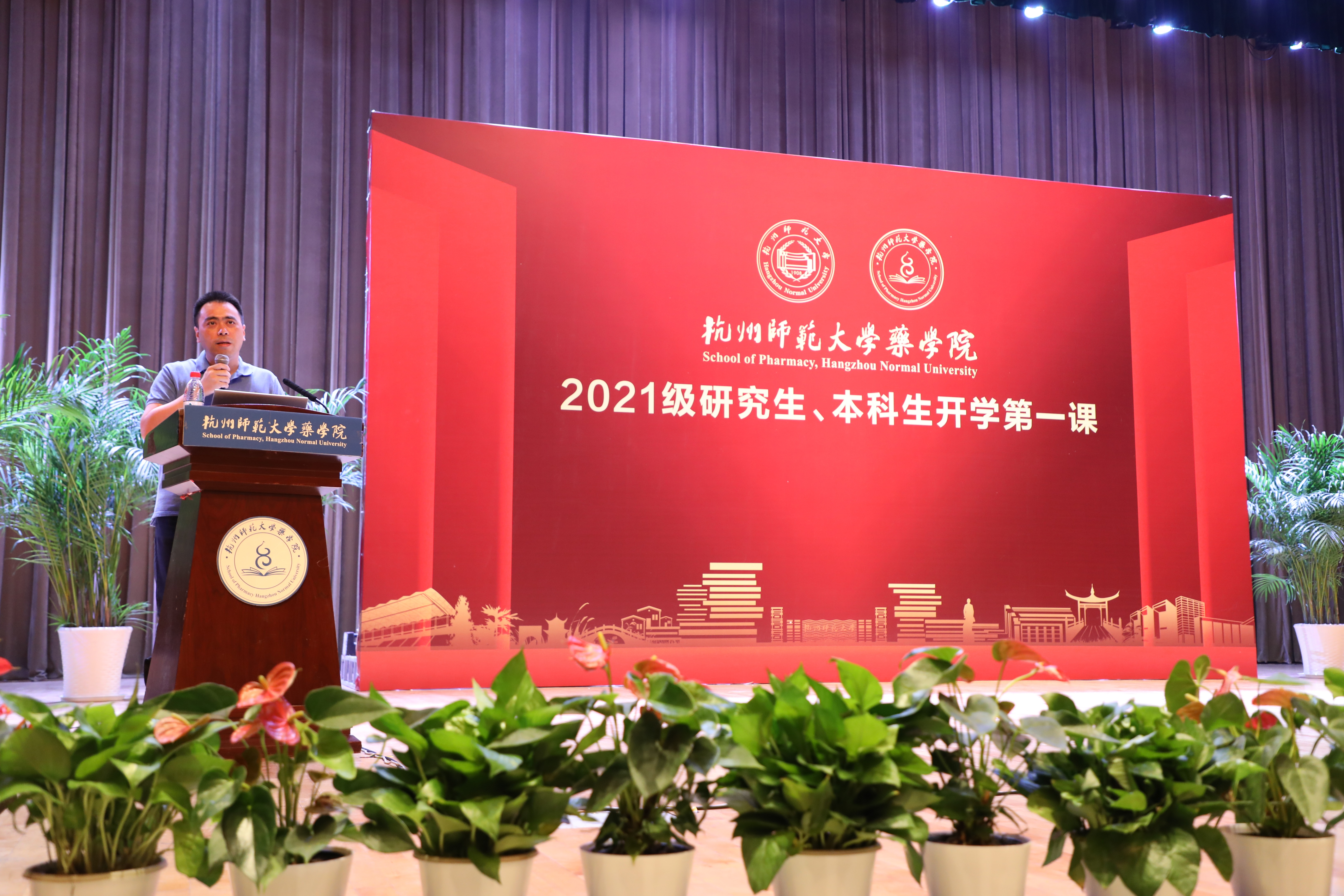 2021年9月28日上午,杭州师范大学药学院2021级药学研究生、本科生开学第一课于杭师大仓前校区恕园7号楼500座隆重举行。出席本次见面会的领导有药学院院长谢恬老师、药学院书记赵飞老师、药学院副院长黄智慧老师、药学院副院长沈嘉炜老师、院长助理陈大竞老师。参会人员有药学院全体教师、2021级全体研究生、本科生。本次见面会由沈嘉炜副院长全程主持。
