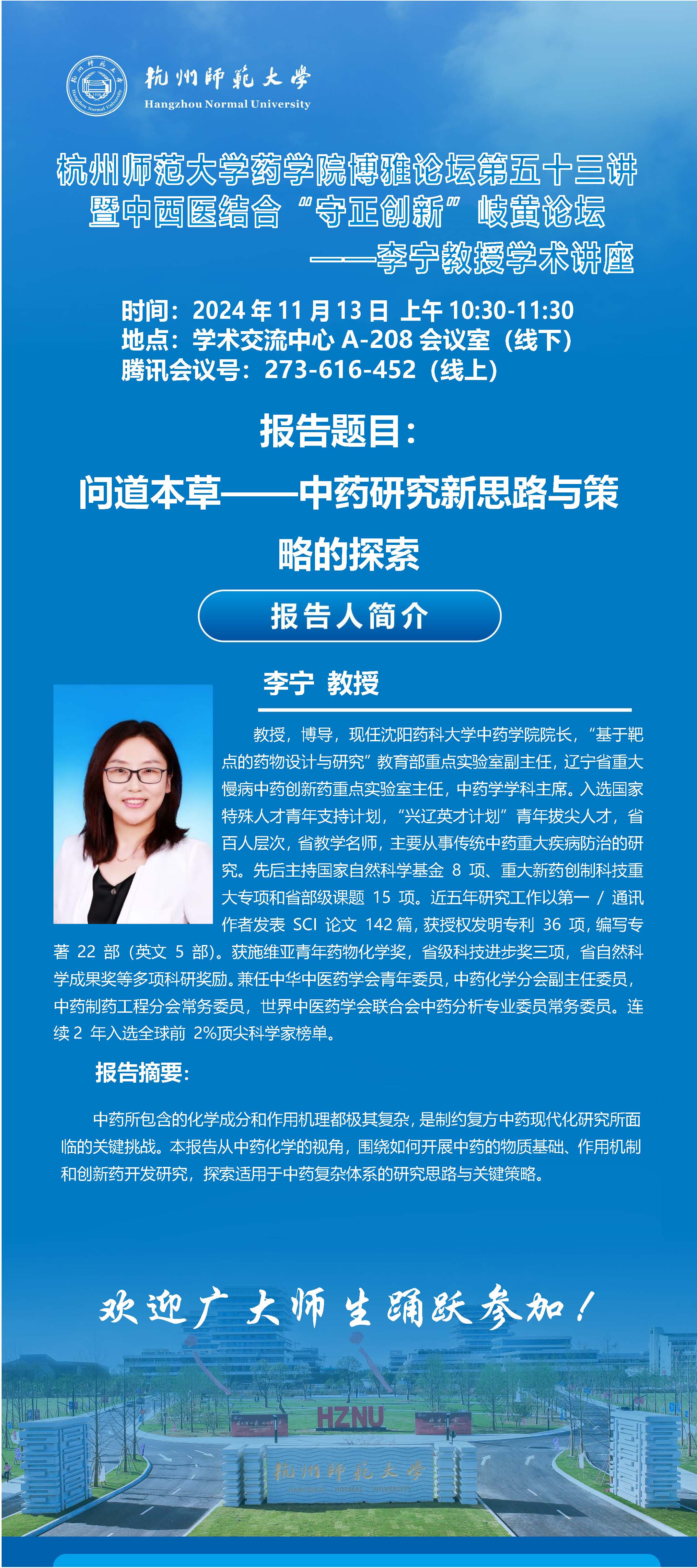 杭州师范大学药学院博雅论坛第五十三讲暨中西医结合“守正创新”岐黄论坛——李宁教授学术讲座