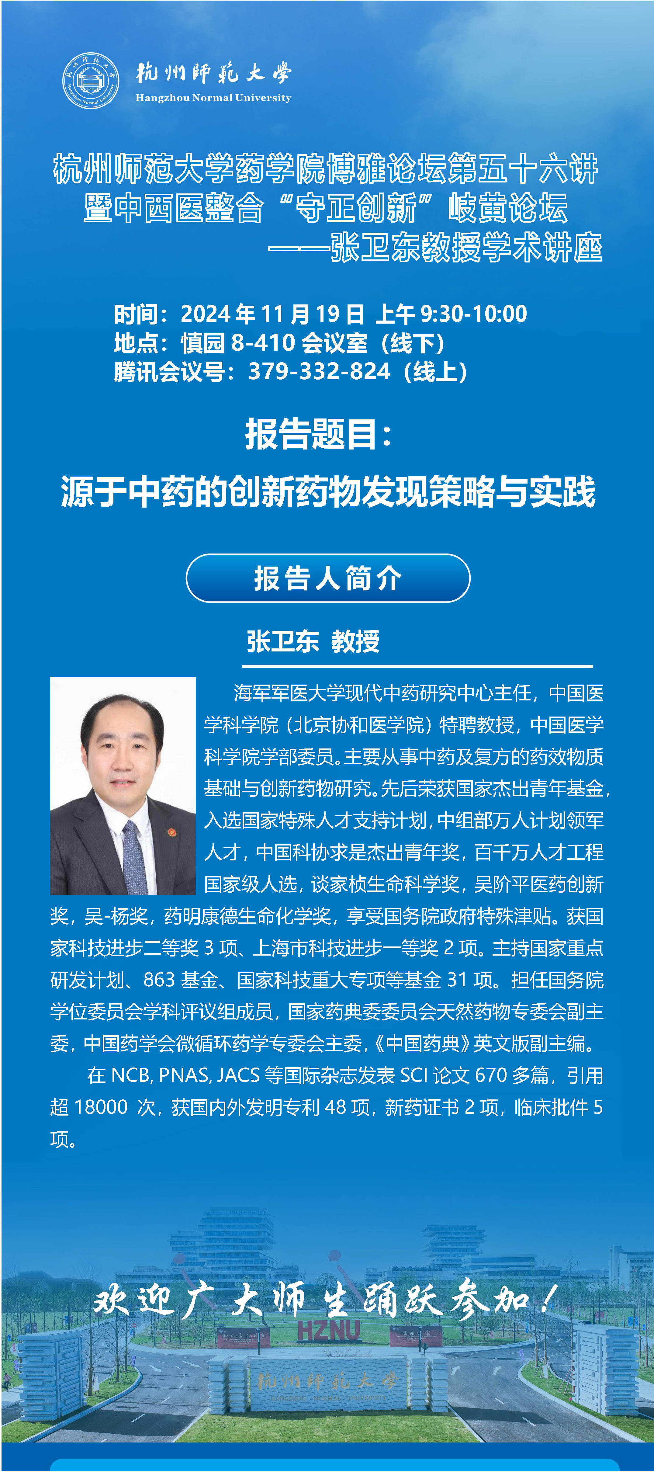 杭州师范大学药学院博雅论坛第五十六讲暨中西医整合“守正创新”岐黄论坛——张卫东教授学术讲座