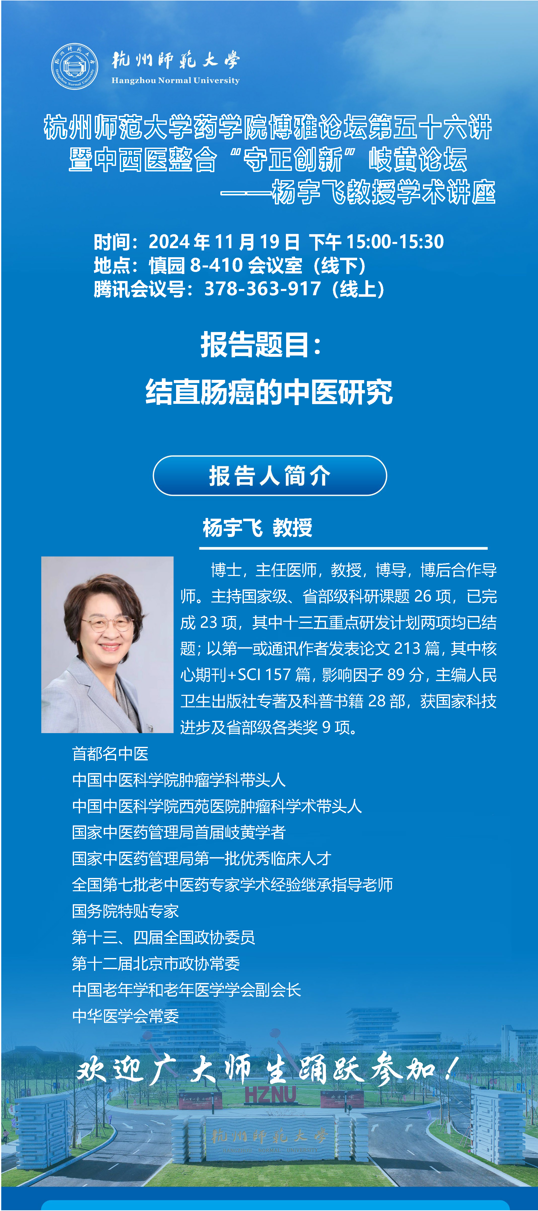 杭州师范大学药学院博雅论坛第五十六讲暨中西医整合“守正创新”岐黄论坛——杨宇飞教授学术讲座