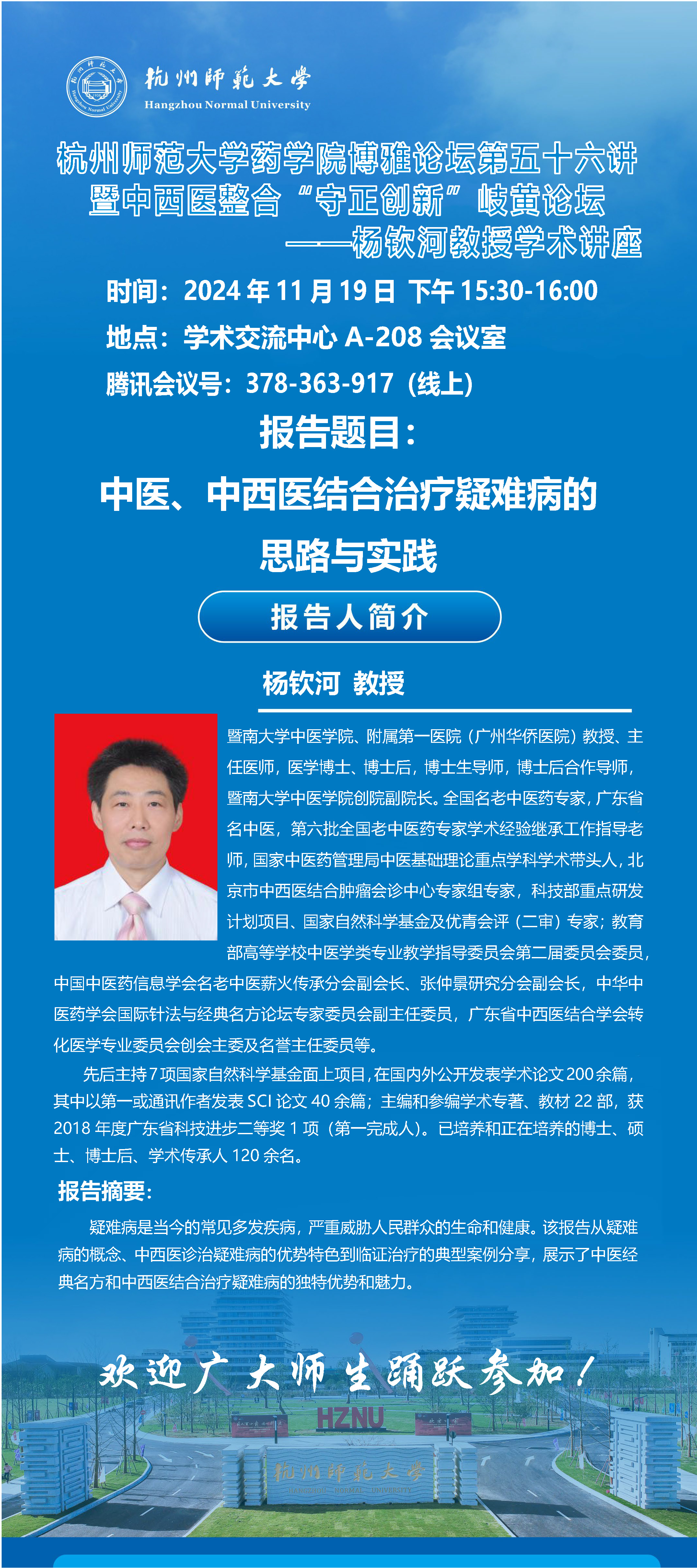 杭州师范大学药学院博雅论坛第五十六讲暨中西医整合“守正创新”岐黄论坛——杨钦河教授学术讲座