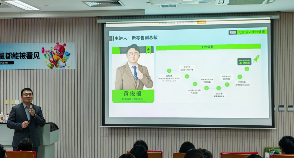 会上,主讲人黄俊楠向同学们介绍了知原药业的概况、研究领域、所创成就以及理念目标。知原药业在2019年投身于互联网医药电商行业,成立新零售部门,而后设立杭州分公司,并致力于将知原药业打造为一家集品牌、研发、生产、营销、运营、渠道为一体的互联网医药电商头部工业企业。知原药业具有远大的理想,立志成为行业领跑者,引领中国皮肤健康产业走向世界。早在1998年,知原药业第一款皮肤外用药丽芙甲硝唑凝胶获批上市;在今天,知原药业已经成为国内领先的研发生产销售一体化皮肤专科药企,以无锡为总部,拥有700多名专业的员工帮助了超过1亿人次的中国患者拥有健康的皮肤。此次招聘的岗位主要集中于具有多平台运营、精细化产品销售和多部门协调周转能力的本科生,孤立有志于生物医药营销运行行业的同学加入,共同守护中国和世界人民的皮肤健康。